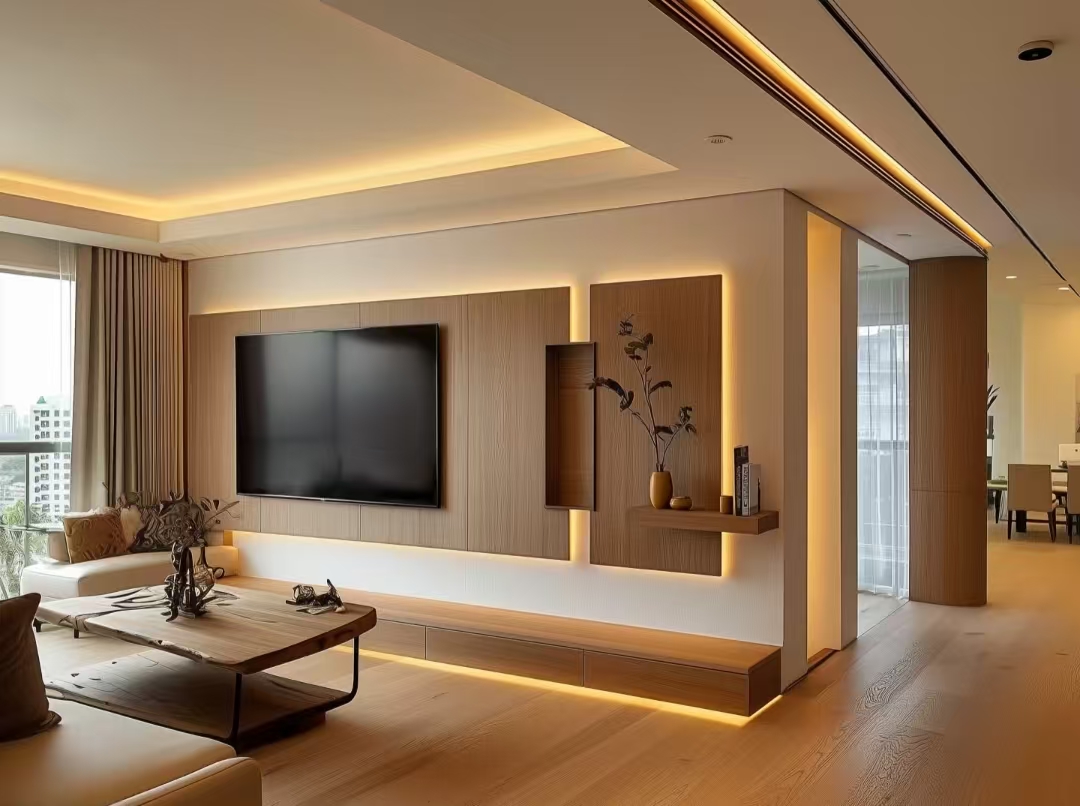 स्वच्छ आणि तीक्ष्ण भूमितीय आकारांसह मिनिमलिस्ट टीव्ही भिंत.