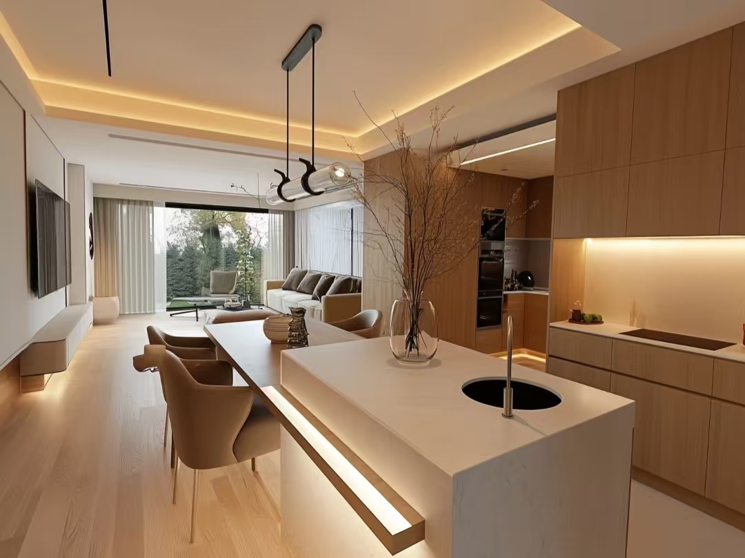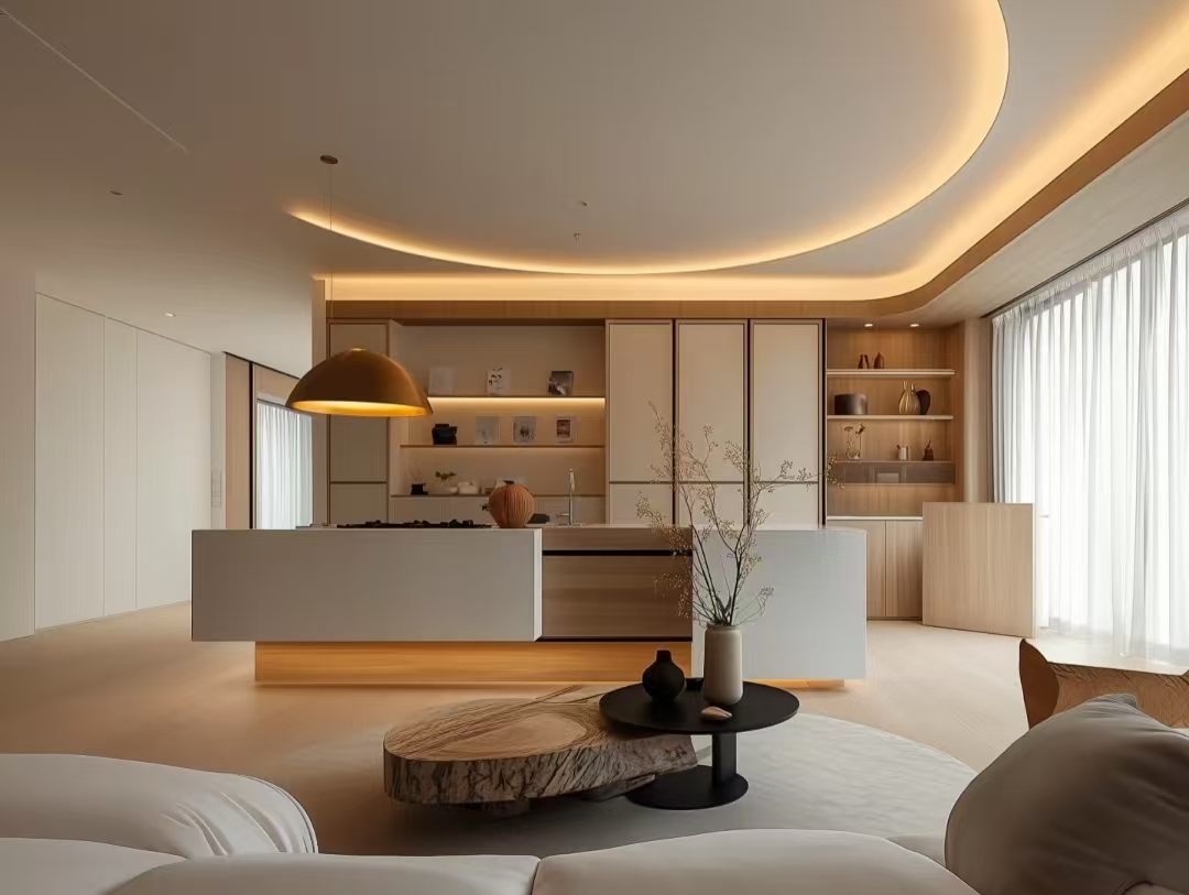 चिरंतन, दीर्घकाळ टिकणारे घर तयार करण्यासाठी क्रीम व्हाइट आणि नैसर्गिक लाकूड रंगांचा वापर करणे.