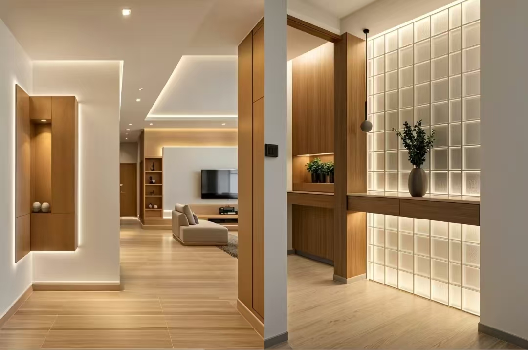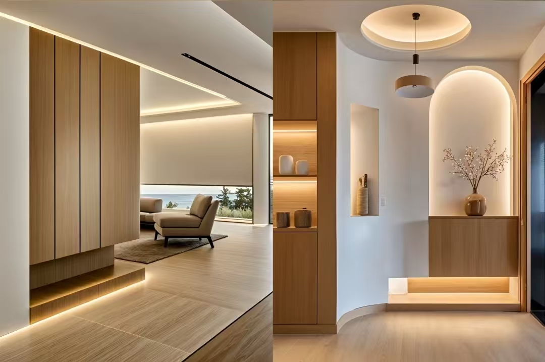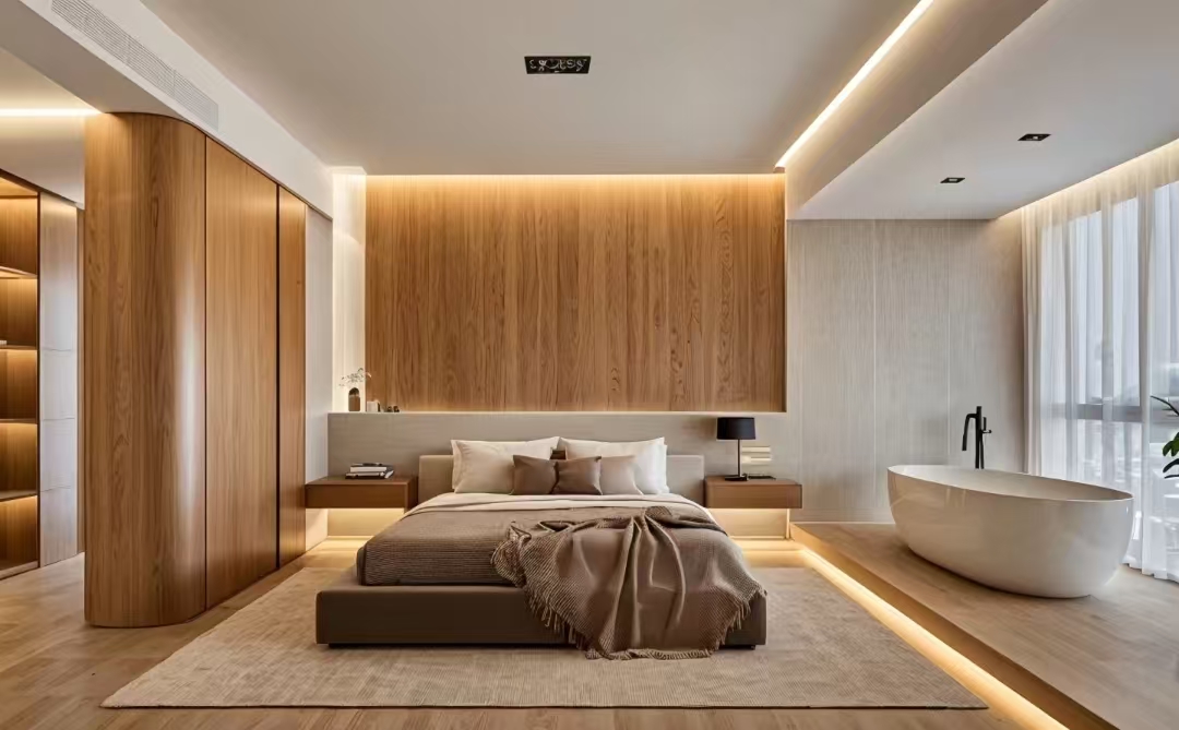 लाकडी समाप्त एक सौम्य स्पर्श, उबदार आणि थंड टोन एकत्रित करते.