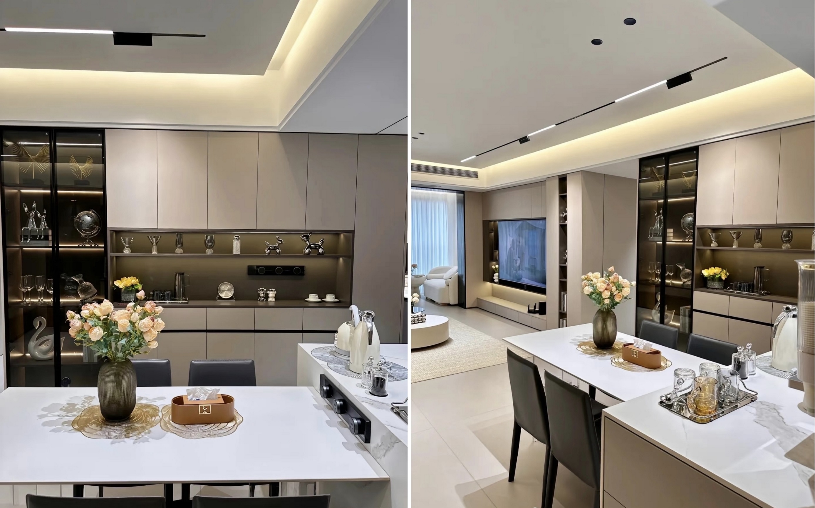 5. लिव्हिंग रूम आणि डायनिंग रूममध्ये एक निलंबित कमाल मर्यादा 15 सेंटीमीटरने खाली असलेल्या मोठ्या, ओपन-टॉप डिझाइनचा अवलंब करते.