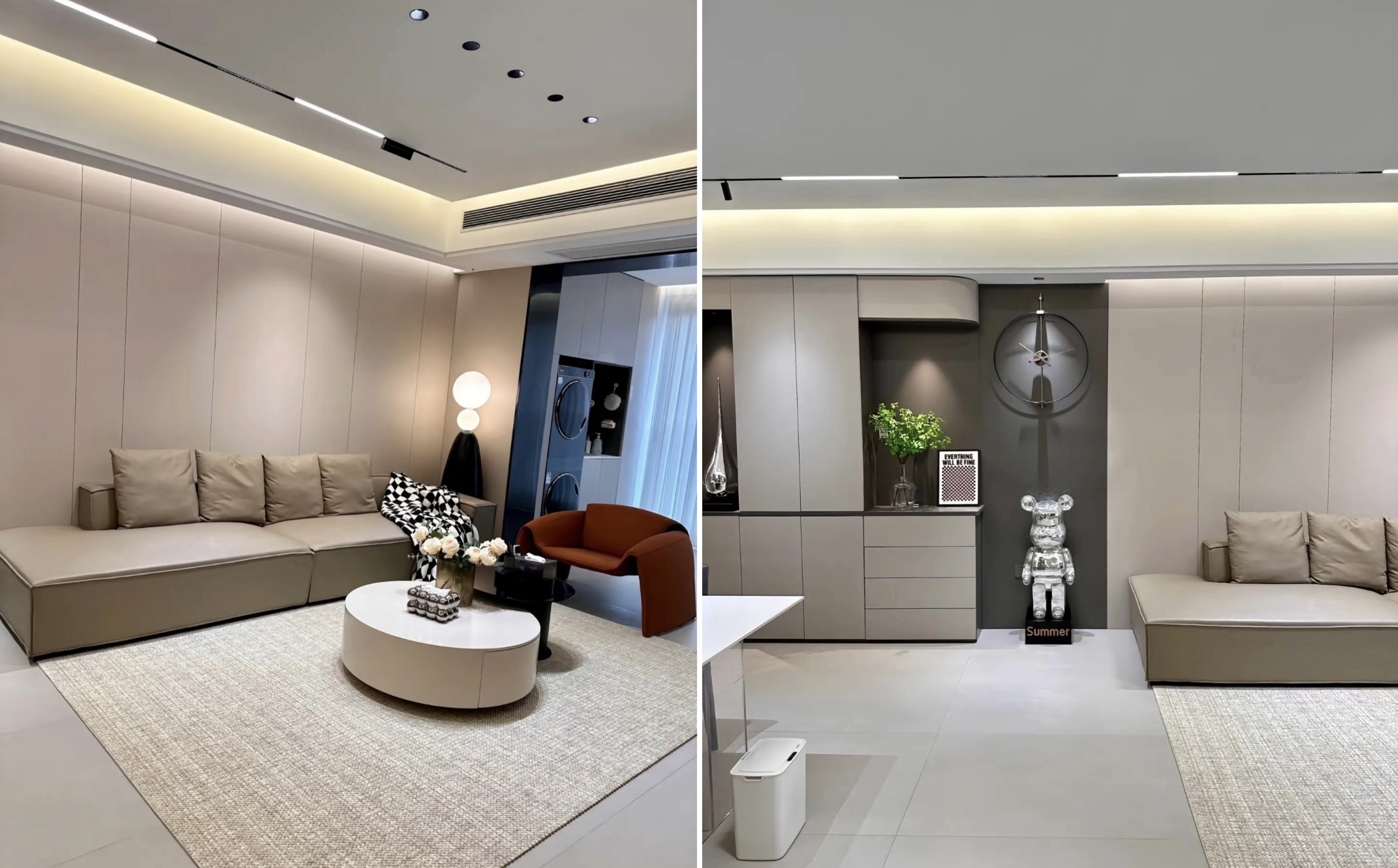 3. एकूण रंगसंगती महत्त्वपूर्ण आहे. लिव्हिंग रूममध्ये पांढर्या, उबदार राखाडी आणि गडद राखाडी मुख्य रंग म्हणून वापरली जाते, एक उच्चारण रंग म्हणून काळा, एक आरामदायक आणि कर्णमधुर वातावरण तयार करते.